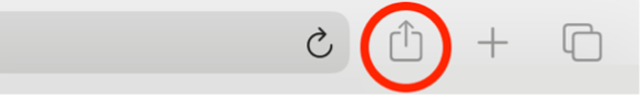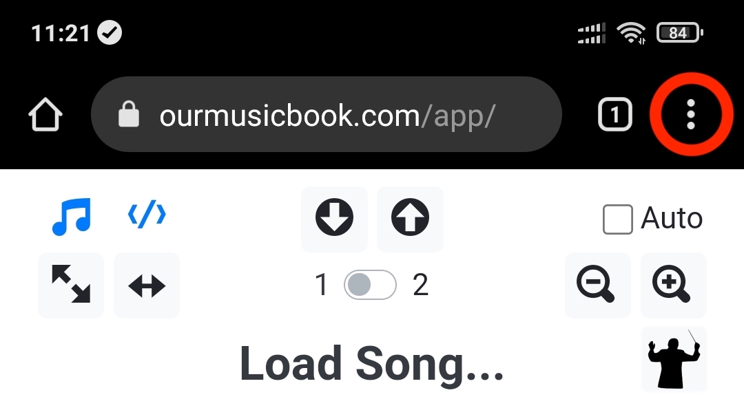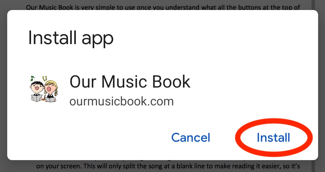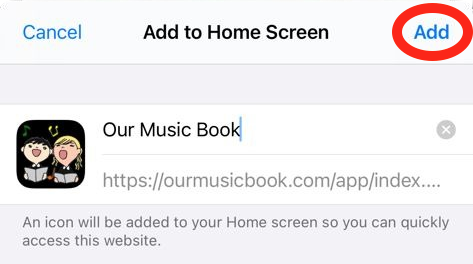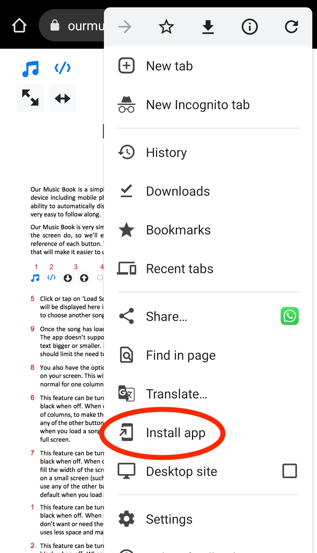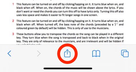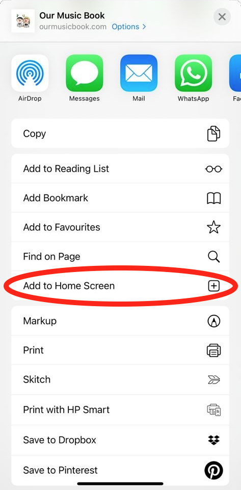 In order to keep costs to a minimum, Our Music Book is a web app which means you install it directly from here. To install it on your mobile device, tap on Our Music Book App below and, once the page has loaded, tap on the icon shown in red below. It will bring up a menu.